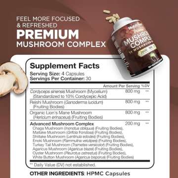 Nutrivein Mushroom Supplement - 2600mg 120 Capsules - 11 Organic Mushrooms - Lions Mane, Cordyceps, Chaga, Reishi, Turkey Tail, Maitake, Shiitake, Agaricus, White Button, Oyster - Nootropic Complex
