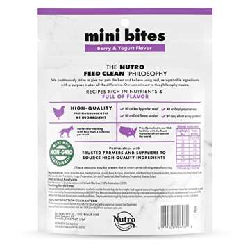 The delightful Berry & Yogurt flavor provides a taste that dogs absolutely love, reminiscent of their favorite berry snacks. Packaged in a convenient 8 oz. bag, these NUTRO Mini Bites are easy to carry, making them perfect for training outings, walks, or simply enjoying at home. Whether your dog is large or small, they will enjoy the scrumptious bites that keep tails wagging and appetites satisfied.