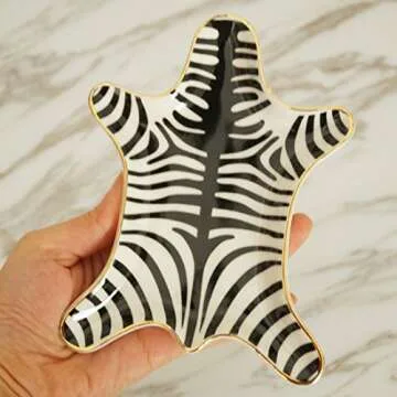 NUYKOUY Zebra Stripe Jewelry Tray Ceramic Dishes Plate Gilded 5.9", Gold (Black)