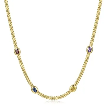 Show more Introducing the NUZON Colorful CZ Station Necklace, a luxurious fusion of vibrant aesthetics and unparalleled craftsmanship. This exquisite piece features four oval-cut colorful cubic zirconia stones, each painstakingly set within stunning gold bezels, bringing a burst of colors that can effortlessly elevate any ensemble. The necklace is crafted with a thick Cuban chain, which is expertly electroplated with 18K gold, offering a sophisticated shine perfect for day or night. Its premium brass construction ensures durability while being nickel and lead-free, making it safe for everyday wear.