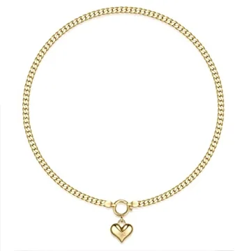 NUZON Love Heart Pendant Necklace for Women 18K Gold Plated Thick Flat Herringbone Snake Chain Choker Engraving “Love You” Charm Sailor Lock Layering Jewelry 16’’
