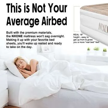 Show moreDiscover the unparalleled comfort and convenience of the NXONE Air Mattress, your ultimate solution for a luxurious sleeping experience at home or on the go. This impressive 18-inch inflatable airbed boasts an extra-thick, eco-friendly PVC construction that combines durability with a plush, soft and waterproof flocked top to provide uninterrupted night after night of cozy rest. Unlike ordinary inflatable mattresses, the NXONE is designed with a built-in pump that allows for easy inflation in just 3-5 minutes, ensuring you can tailor its firmness to your liking without any hassle.