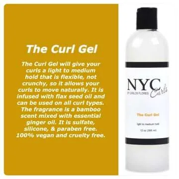 Show more Unlock the secret to gorgeous, defined curls with NYC Curls Curl Gel. This revolutionary styling product is meticulously formulated to deliver a light to medium hold that keeps your curls intact while ensuring they look and feel completely natural. Unlike traditional gels that make your hair feel crunchy, this curl-enhancing gel offers a flexible hold, allowing your curls to move freely while maintaining their shape. Infused with flax seed oil, it provides essential hydration and nourishment to your curls, locking in moisture for a healthy, vibrant appearance.