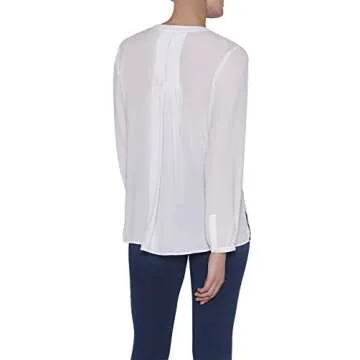 Introducing the NYDJ Women's Pintuck Blouse, a chic and sophisticated staple that elevates any wardrobe. Crafted from soft georgette fabric, this blouse is an absolute delight to wear. It features a flattering three-quarter sleeve design that suits all body types, making it a versatile choice for both work settings and casual day outings. The blouse stands out with its refined split round neckline complemented by a covered full front placket...
