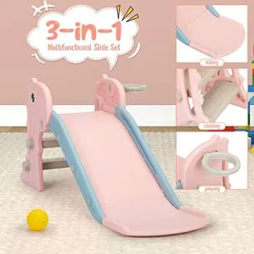 Unlike other toddler slides on the market, the Nyeekoy 3 in 1 Toddler Slide stands out with its multifunctional design that combines a slide, basketball hoop, and inflatable ball, promoting diverse physical activity. Many competitors offer simple slides without additional features or safety measures, whereas this playset prioritizes both fun and safety. Additionally, its lightweight and foldable nature makes it more portable than many bulky models, allowing for easy setup in any space.