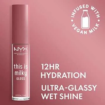 Show more Introducing the NYX Milky Gloss, where luscious lips meet delightful hydration. This stunning lip gloss offers a buildable splash of milky color with a gorgeous ultra-glassy wet shine, making it the perfect addition to your makeup collection. With just one swipe, achieve a radiant look that can be layered for increased saturation, providing you the versatility to express your style. The formulation is not just about looks; it boasts 12 hours of hydration to keep your lips moisturized and comfortable throughout the day.