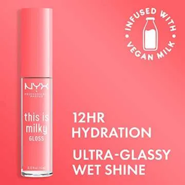 Show more Experience the luscious allure of NYX Professional Makeup's Milky Gloss, a mesmerizing lip gloss that redefines your pout with a buildable splash of milky color and a flawless ultra-glossy shine. This innovative formula hydrates your lips for up to 12 hours, bestowing an irresistible gloss that feels as good as it looks. With a variety of soft shades ranging from gentle nudes to rich chocolate browns, you're sure to find the perfect match for any occasion.