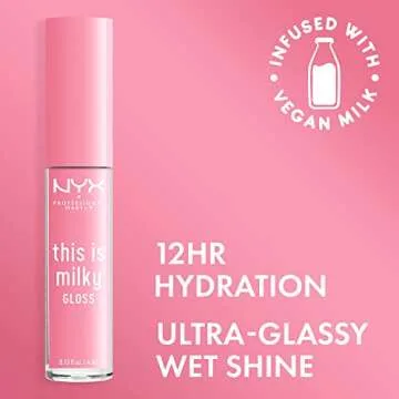 Show more Indulge your lips with the delectable NYX PROFESSIONAL MAKEUP This Is Milky Gloss, designed to transform your pout into a luscious canvas of sheer beauty. Formulated to deliver a buildable splash of milky color with an ultra-glassy wet shine, this vegan lip gloss allows you to create your desired look with just one swipe or layer it for increased saturation. Offered in a delightful range of soft shades—from gentle nude to rich chocolate brown—this gloss caters to all your lip needs while ensuring your lips stay moisturized for up to 12 hours. Infused with a dairy-free vegan milk blend and a sweet addictive vanilla milkshake scent, every application not only beautifies but also nourishes your lips.