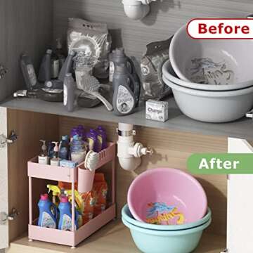 NYYTGE Double Sliding Under Sink Organizer, 2 Tier Bathroom Organizer with 1 Cup 4 Hooks, Multi-purpose Under Cabinet Storage Rack, Under Sink Organizers and Storage for Home Kitchen Organization