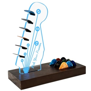 The holder features a built-in LED light that enhances its visual appeal, making it a standout piece among guitar decor and collections. This illumination can be adjusted to various brightness levels and colors, providing personalized ambiance while celebrating a passion for music. Whether it's on your desk, bookshelf, or studio, this pick holder adds a creative touch to your environment.