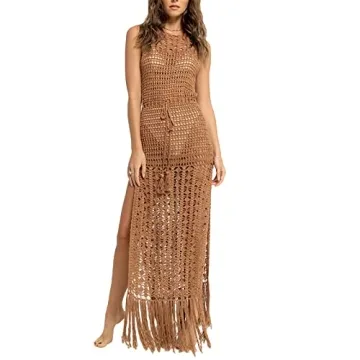NZNDSHD Women See Through Sleeveless Swimwear Sexy Crochet Dress Fringe Hem Cover Up Summer Long Maxi Beach Dress (Khaki, S)