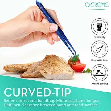 With their ergonomic design, these tweezers allow for a comfortable grip while their micro-serrations on the tips ensure secure handling of your ingredients. The straight-tip tweezers are ideal for easy grabbing and plating, while the curved-tip tweezers enable placement from different angles, making them versatile tools for any chef. Whether you’re crafting delicate hors d'oeuvres or beautifully plating a gourmet dish, the O'Creme Precision Tweezers are your go-to solution for professional-grade results.