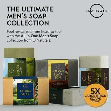 Show more Discover the ultimate grooming experience with our specially curated 5PC Daily Essential Natural Soaps designed for the active man. This premium soap set includes five XXL bars, each infused with unique scents including fresh Mint, aromatic Cedarwood, zesty Citrus, nourishing Olive Oil, and rich African Black Soap. Handmade with care, these organic soap bars are packed with natural essential oils that leave your skin feeling refreshed, moisturized, and invigorated throughout the day.