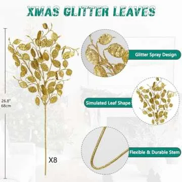 Show more Introducing the **Oairse 8 Pcs Gold Glitter Christmas Tree Picks & Sprays**, your new go-to decoration for the festive season! Each piece is meticulously crafted to mimic the enchanting appearance of real feathered branches, giving your Christmas trees, wreaths, and garlands a touch of elegance. The glimmering glitter coating reflects light beautifully, adding a magical sparkle that brightens up any setting. Lightweight yet remarkably durable, these picks are designed to withstand multiple holiday seasons, ensuring your decor maintains its stunning appeal year after year.