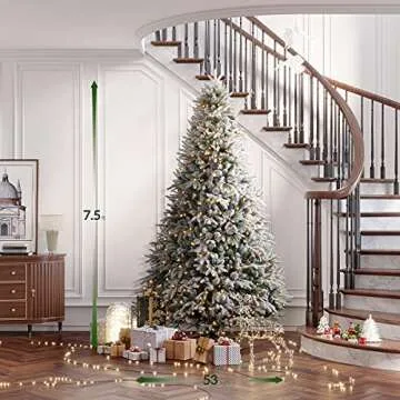 OasisCraft 7.5FT Snow Flocked Pre-lit Christmas Tree, Premium PVC & PE 1386 Branch Tips Hinged Xmas Tree with Pine Cones and Red Berries, Equipped Folding Metal Stand for Outdoor and Indoor Decoration