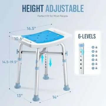Comfort is of the essence, and this chair does not disappoint. The detachable padded bath seat allows for easy cleaning while providing a cushioned surface that enhances your bathing experience. Designed with anti-slip rubber feet and integrated drainage holes, this shower chair not only ensures safety but also keeps you dry and comfortable during use. With dimensions of 13" x 14" and adjustable heights from 14.5" to 19.5", it is perfectly suited for smaller bathrooms and adaptable for individual user needs.