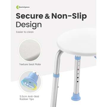 One of the standout features of the OasisSpace Shower Chair is its adjustable height settings, offering six different heights ranging from 14" to 19". This customization ensures that users of various heights can find their perfect fit, promoting comfort during use. The chair's non-slip seat and legs provide stability, enhancing the safety of its users by preventing slips and falls in wet environments.