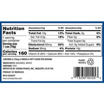 Show moreDiscover the delightful taste and nutrition of Ocean Prince No-Salt Added Sardines, a product crafted with care from the pristine waters of Morocco. Each case contains twelve 4.25-ounce cans, making it the perfect pantry stock for your culinary needs or a thoughtful gift for health-conscious friends and family. These wild-caught sardines are hand-packed in water, ensuring you enjoy them at their freshest and most flavorful. Plus, they're Non-GMO Project Verified and hold a Friend of the Sea Certification, promoting sustainable seafood practices.