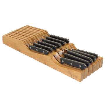 Show moreDiscover the ultimate solution for knife storage with this exceptional bamboo knife organizer. Crafted with precision, it can comfortably hold up to 11 knives, making it a must-have for any kitchen enthusiast. Unlike traditional knife blocks, this organizer allows for easy removal and storage of knives, ensuring optimal accessibility when you need it most. With its slender design, it fits perfectly in your kitchen drawer, freeing up counter space and enhancing the aesthetics of your kitchen.
