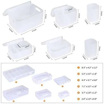 The set includes a combination of 12 different sizes, featuring four frosted cases, two striking cylinders, four versatile plastic cases, and two practical boxes with partitions. This thoughtful design allows for a free combination of various sizes, making it versatile for any room - be it your makeup vanity, closet, or craft area.