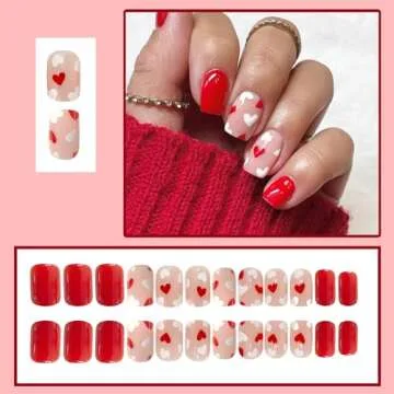 OCOUYVD Heart Press on Nails Short Square Valentines Fake Nails Petite Red Stick on Nails Full Cover False Nails with Red White Heart Designs Acrylic Nails Glossy Artificial Nails for Women Girls