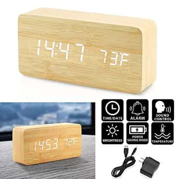 Show more This exceptional alarm clock seamlessly combines style and functionality, making it a reliable addition to any home. With its wood grain finish and sleek design, it fits effortlessly into your décor, whether it’s by your bedside or part of your entertainment setup. The clear digital display ensures you can easily read the time and temperature from across the room, even in low light. Powered by either batteries or USB, this clock not only provides continuous time-keeping during power outages, but it also offers a few thoughtful customizable features.
