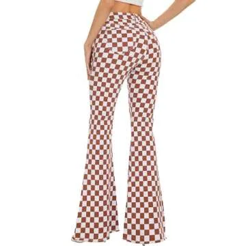 Odefou Bell Bottom Jeans for Women High Waisted Stretch Plaid Flare Jeans Denim Bootcut Pants(Rust Red Plaid,4)