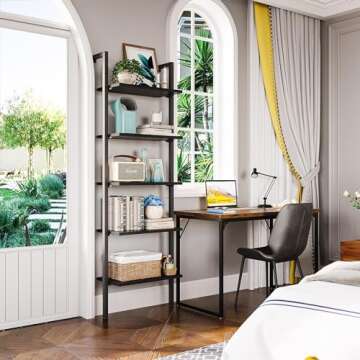 Show more Transform your living space with this stunning multifunctional ladder shelf! Crafted with precision, this 74” tall shelf effortlessly balances storage needs and decorative appeal, making it an essential piece for any modern home. The sleek black finish of the shelves, combined with a durable metal frame, creates an industrial aesthetic that is both sophisticated and simple. You can utilize this stylish shelving unit to display your cherished books, vibrant plants, or framed memories, all while enhancing the look of your empty walls with remarkable style.