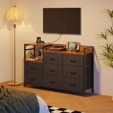 ODK Dresser with Charging Station, 52-Inch Long Dresser for Bedroom with 8 Storage Drawers, Fabric Dressers Chests of Drawers with Sturdy Steel Frame and Wooden Top, Vintage and Black