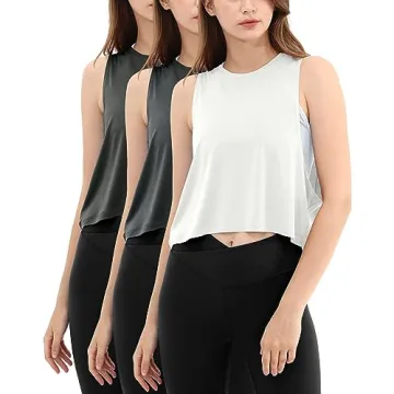 ODODOS 3 Pack Crop Tank for Women Loose Sleeveless Workout Gym Cropped Yoga Shirts Muscle Tops, Black, Charcoal, White, Small