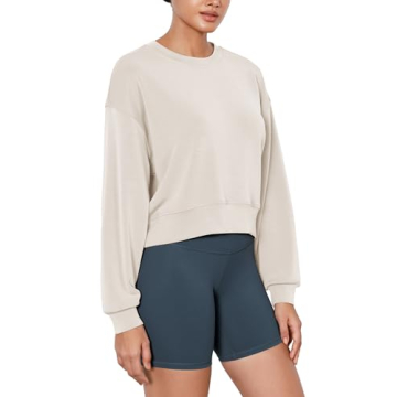 ODODOS Modal Soft Long Sleeve Cropped Sweatshirts for Women Oversized Crew Neck Pullover Crop Top, Ivory, Medium