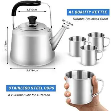 Show more Introducing the Perfect Camping Tea Kettle Set – an essential companion for your outdoor adventures! This meticulously crafted set includes a generous 4L kettle paired with 4 stainless steel mugs (each holding 400ml), designed for sharing quick cups of coffee or tea amidst nature's beauty. Whether you’re camping under starry skies or picnicking in the park, this set ensures every steaming sip is a moment to cherish.