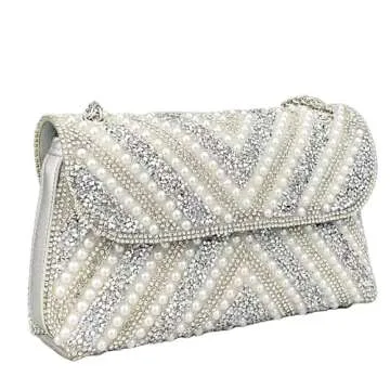 OEIPSMK Women's gold sequin evening clutch. Women's Gold Chain Evening Bag with Pearls (Red1), Sivery