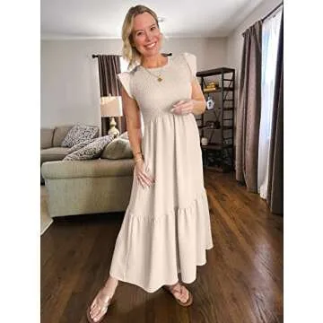 OFEEFAN Long Maxi Dresses for Women Casual Flutter Sleeve Ruffle Dress Travel Outfits Beige L