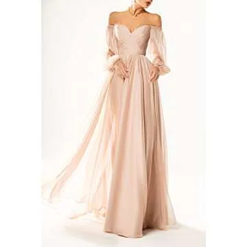 Show more Indulge in the exquisite elegance of our off-the-shoulder long sleeve formal dress, designed to dazzle at any special occasion. This enchanting gown features a stunning pleated chiffon fabric that gracefully flows with every movement, ensuring you're the center of attention at events ranging from elegant weddings to prom night celebrations.
