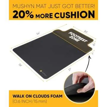 Show moreTransform your workspace into a haven of comfort and productivity with the Mushyn Office Chair Mat with Anti-Fatigue Cushioned Foam. Measuring an expansive 54”x36”, this innovative mat is designed specifically for hardwood floors, acting as both a protective shield against scratches and a supportive base for your feet. Your daily work routine deserves the best, and this mat seamlessly enhances your experience, whether you're sitting or standing. The unique 2-in-1 design promotes better posture and ergonomics, allowing you to switch between work positions effortlessly. Protect your floors while pampering your feet!