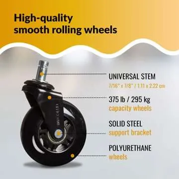 Show moreIntroducing the ultimate upgrade for your workspace – our Office Owl rollerblade-style desk chair wheels! Designed to provide a seamless and efficient glide, these wheels are perfect for anyone seeking to enhance their work or gaming experience. The universal fit of our wheels means you can say goodbye to the frustration of incompatible casters, as they easily accommodate most office chair designs (note: not compatible with IKEA chairs). Imagine transforming your standard desk chair into a smooth-rolling, effortless gliding seat that offers unrivaled comfort while working or gaming! The unique design features a 7/16'' x 7/8'' stem size, ensuring a perfect fit for your existing chair. With no mat required, you can effortlessly roll across various surfaces, from hardwood and tiles to short carpets, without scratching them. Our wheels are crafted to provide a superb swivel action, making maneuvering a breeze – no more squeaks or creaks! Made from high-quality steel, these wheels can withstand up to 650lbs, ensuring they’ll hold up under any circumstance for years of continuous use. Installation is a snap; simply push them into place and you're ready to roll! Don't miss out on this opportunity to enhance your mobility and comfort. Say farewell to old, squeaky wheels and embrace a smooth gliding experience that will reinvigorate your productivity.