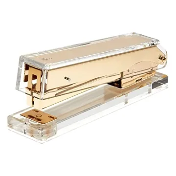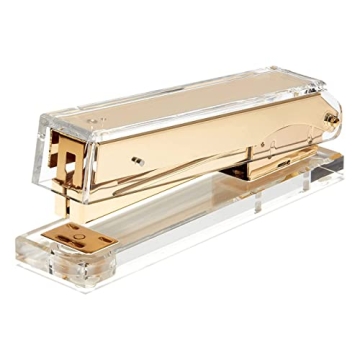 Show more Transform your workspace with the elegant OfficeGoods Acrylic Stapler, a perfect blend of functionality and style. This breathtaking stapler, available in a stunning gold finish, is designed to elevate the aesthetic of any desk, whether at home, in the office, or school. Made from high-quality acrylic and durable metal, it boasts a unique design that not only looks gorgeous but also performs flawlessly. It is capable of stapling up to 15 sheets at once, making it as practical as it is chic. Measuring at 5 7/8" x 2 3/4" x 1 3/8" with a reach of 3.25", this stapler offers the perfect size for easy handling and storage. The OfficeGoods Acrylic Stapler takes standard 1/4" staples and is packaged safely to ensure that it reaches you in perfect condition, ready to be showcased on your desk.