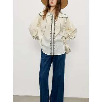 Show more Step into comfort and style with the OFSOAK Women's Embroidered Tops – a perfect blend of sophistication and ease. Crafted from a breathable mix of 65% cotton and 35% polyester, this shirt provides a skin-friendly feel, ensuring you remain cozy throughout the day, whether you're at work or out on the town. The lightweight fabric makes it an ideal choice for layering, while its timeless beige color complements any wardrobe, making it easy to mix and match with various outfits.