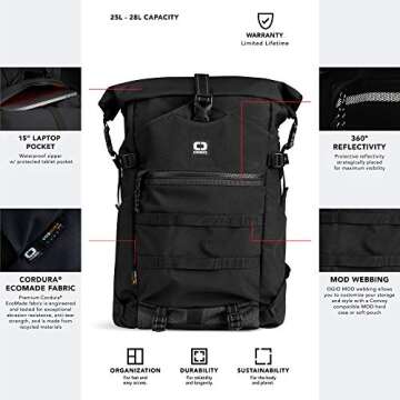 The OGIO Alpha Convoy 525r Rolltop Backpack in sleek black is not just a backpack; it's a robust solution for today’s dynamic lifestyle. Crafted with premium Cordura Eco fabric, this backpack promises exceptional durability and sustainability by utilizing recycled materials, ensuring a positive environmental impact without sacrificing style.