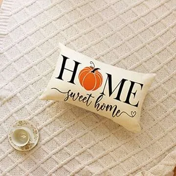 Show more Introduce warmth and charm to your home with the Ogiselestyle Home Sweet Home Pumpkin Fall Lumbar Throw Pillow Cover. Measuring at a comfortable 12 x 20 inches, this elegant cushion cover is perfect for adding a seasonal touch to your decor during autumn and Thanksgiving celebrations. Made from high-quality polyester material, this pillow cover boasts a delightful "Home Sweet Home" pumpkin design on one side, making it an eye-catching accessory for any living space. Not only does it enhance your home's aesthetic, but it also provides a soft and cozy feel, perfect for lounging on your sofa or couch.
