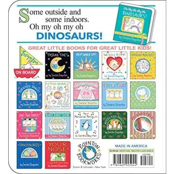 Show moreIntroduce your little dinosaur enthusiast to a world of fun, learning, and adventure with "Oh My Oh My Oh Dinosaurs!: A Book of Opposites" by Sandra Boynton. This delightful board book is not only a treat for the eyes but also a journey through the whimsical world of opposites, packed with charming illustrations and playful rhymes that will engage young minds. Perfectly sized for little hands, this sturdy book will withstand the excitement of every page turn, making it a wonderful read-aloud experience for both parents and children. Explore a vast range of opposites through the eyes of adorable dinosaurs that march, stomp, and play in vibrant colors, ensuring your little one are captivated from the first page to the last.