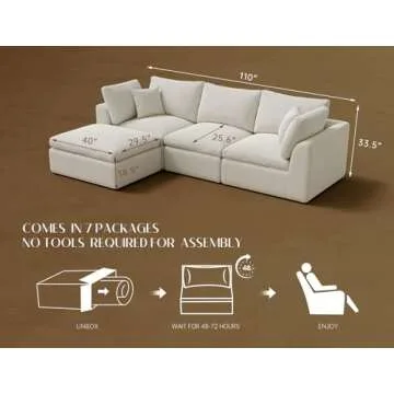Show more Experience the ultimate comfort with the Ohllob Modular Sectional Sofa, designed to redefine relaxation in your living space. This innovative cloud-like sofa comes in an easily transportable format, arriving in 4 separate boxes that simplify delivery through tight hallways or narrow doorways. Upon unboxing, the assembly process is practically non-existent—just arrange the cushions and let them expand naturally without any tools or complicated steps. Imagine sinking into an oasis of softness, thanks to its high-resilience foam filling and luxurious skin-friendly chenille fabric that feels divine against your skin.