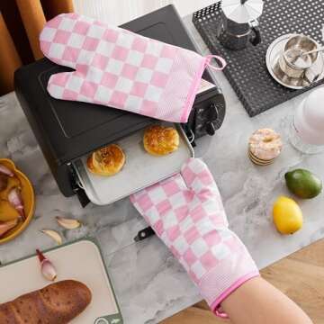 Ohocut Pink Checkered Oven Mitts Heat Resistant, Vintage Retro Checkerboard Cute Oven Mitts, Non-Slip Silicone Kitchen Oven Mitts Gloves 1 Pair 7''x13''