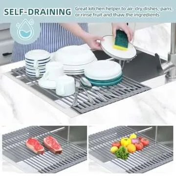 Ohuhu Roll Up Sink Rack, Over The Sink Dish Drying Rack, 20.5" W x 13.1" L Rolling Dish Drainer Foldable Sink Accessories Heat-Resistant Mat Anti-Slip Silicone Coated Dish Racks for Kitchen Counter
