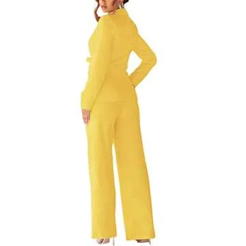 Show more Step into elegance with the Ohvera Women's Solid Long Sleeve Front Bow Tie Two Piece Blazer Wide Leg Pants Suit Jumpsuit. Tailored to perfection, this suit in a vibrant yellow will ensure you stand out at any occasion. Featuring a stylish front bow tie detail, this ensemble not only elevates your style but also adds a touch of femininity to your look. The included wide leg pants offer a flattering fit and the jumpsuit style combines both comfort and sophistication, making it your go-to choice for day and night events. Designed with a modern collar, this jumpsuit is ideal for the modern woman who values both style and comfort.