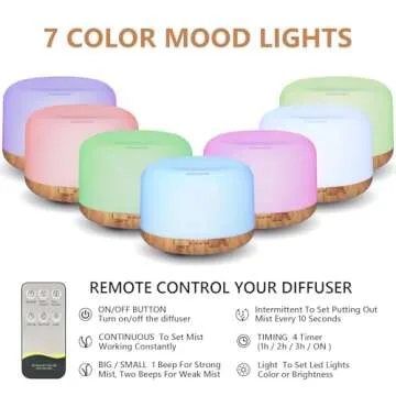 Oil Diffuser, 500ml Essential Oil Diffusers, Aromatherapy Diffuser with 2 Mist Mode 4 Timers&7 Ambient Light Waterless Auto Off, Diffusers Large Room Home Office