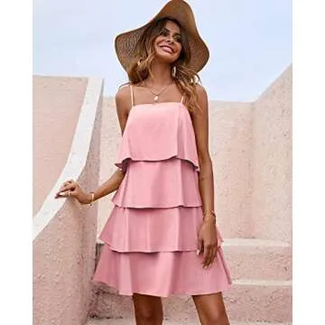 The Okiwam Women's Summer Casual Boho Spaghetti Strap Sleeveless Short Dress combines effortless style with everyday comfort in a beautiful pink hue that is perfect for any summer occasion. This dress features a flowy A-line silhouette that flatters various body shapes, making it an essential addition to any wardrobe. The delicate ruffle tiered design gives it a chic bohemian flair, perfect for sunny outdoor events or beach outings. With...