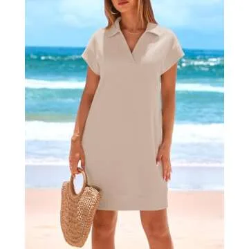 Okiwam Women's Summer Dresses 2025 Casual Loose Mini Dress Short Sleeve V-Neck T-Shirt Dress with Pockets-S Light Khaki