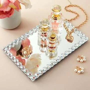 Chic Crystal Mirror Vanity Tray with Bead Diamond Trim for Stylish Decor